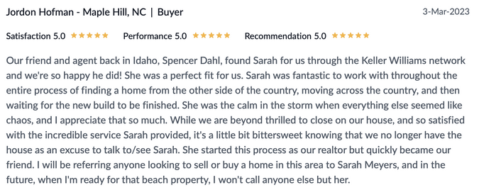 Sarah was the best, seriously, the best! She is so good at what she does and we felt so comfortable and taken care of with her on the job. She knows so much about the area and goes out of her way to figure things out that mean a lot to us. Sarah is one of the best agents I have ever worked with. Because of how she treated us and dealt with us over the long year that we were working with her, I would recommend anyone and everyone to employ Sarah's skills. We would love to eventually (once we hit the lottery... hahaha... but maybe earlier) buy a beach-front property and we will definitely be using Sarah as our agent for that process. There is no one in this area we trust more. Sarah E. Meyers is incredible and you won't be disappointed if you hire her!